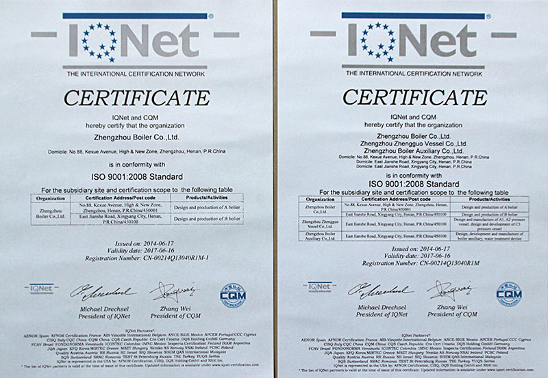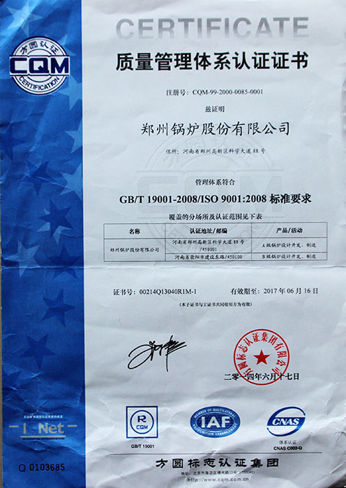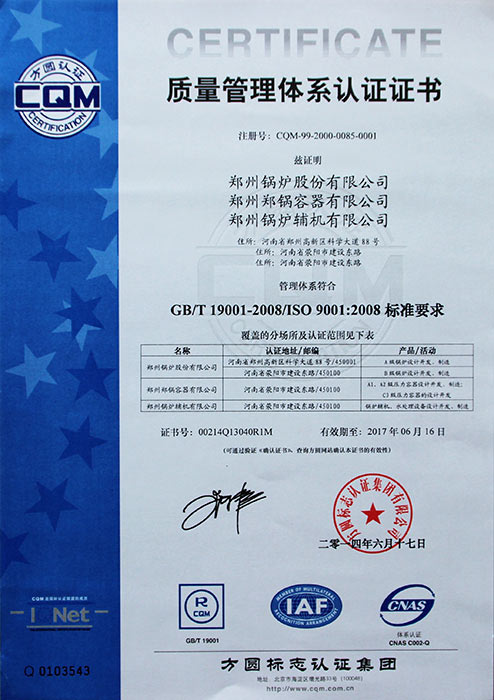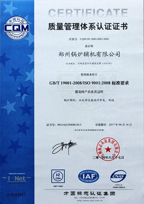 公司于1999年一次通过ISO9001国际质量体系认证,,,,,2002年取得国际认证联盟质量管理认证证书,,,,,2008年一次通过美国机械工程师协会锅炉及压力容器ASME认证等。。。。。。